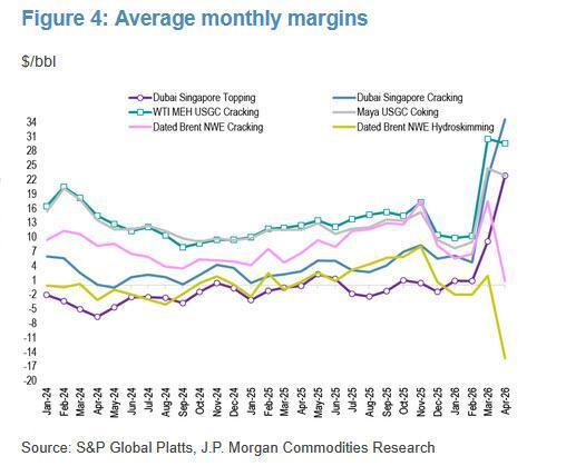 裂解利润率(cracking margins)同样大幅恶化,4月12日降至0.8美元/桶,较3月中旬峰值低约26美元/桶。